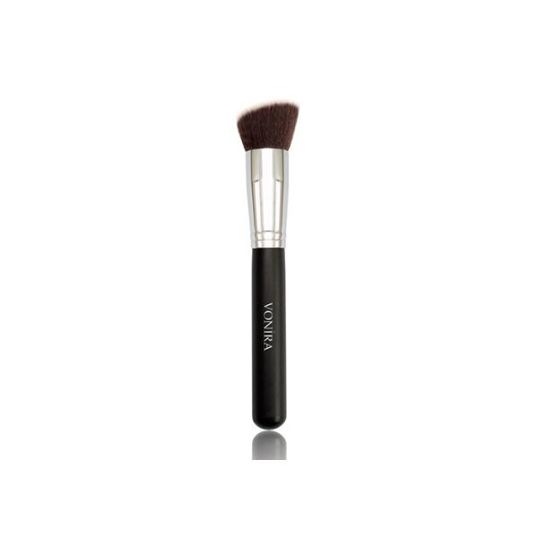 A flat angled brush head with very soft and dense fibers, provides a flawless, high definition foundation finish.